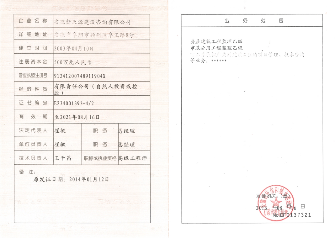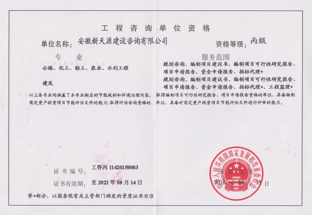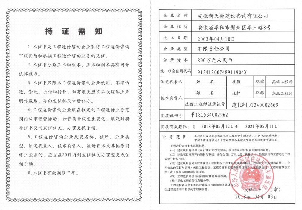 安徽新天源建設(shè)咨詢(xún)有限公司是一家全過(guò)程項(xiàng)目管理咨詢(xún)機(jī)構(gòu),重點(diǎn)開(kāi)展PPP項(xiàng)目咨詢(xún)、BIM項(xiàng)目咨詢(xún)、招標(biāo)代理、工程造價(jià)、工程監(jiān)理、工程咨詢(xún)等業(yè)務(wù)。 公司成立于2003年4月10日,為股份制企業(yè),現(xiàn)注冊(cè)資金5000萬(wàn)元,辦公面積2200多平方米,法人代表崔敏。在成立同年,公司取得了國(guó)家發(fā)展改革委員會(huì)頒發(fā)工程咨詢(xún)資格證書(shū),并成為安徽省工程咨詢(xún)協(xié)會(huì)會(huì)員單位。隨著近年來(lái)的不斷發(fā)展壯大,公司相繼取得了招標(biāo)代理資質(zhì)證書(shū)(工程招標(biāo)代理資質(zhì)資格證書(shū)、政府采購(gòu)代理資格證書(shū)、水利工程招標(biāo)代理資格證書(shū)、中央投資項(xiàng)目招標(biāo)代理資質(zhì)證書(shū))。 2008年11月取得工程造價(jià)資質(zhì)證書(shū)并成為阜陽(yáng)市審計(jì)局審計(jì)協(xié)審定點(diǎn)單位; 2012年3月取得安徽省發(fā)改委固定資產(chǎn)節(jié)能評(píng)估資質(zhì)證書(shū); 2012年3月取得安徽省國(guó)土資源廳測(cè)繪資質(zhì)證書(shū); 2012年7月獲得安徽省經(jīng)濟(jì)和信息化委員會(huì)第一批工業(yè)投資項(xiàng)目節(jié)能評(píng)估機(jī)構(gòu)備案; 2012年9月取得水利工程監(jiān)理資質(zhì)證書(shū); 2014年1月取得工程監(jiān)理資質(zhì)證書(shū);現(xiàn)工程招標(biāo)代理及工程造價(jià)已取得甲級(jí)資質(zhì),并開(kāi)展了環(huán)境影響評(píng)價(jià)、工程測(cè)量、房地產(chǎn)評(píng)估等業(yè)務(wù)。