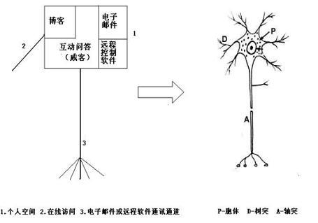 2005年,我們對互聯(lián)網(wǎng)進行研究時,發(fā)現(xiàn)了電子公告牌功能分裂現(xiàn)象,2006年發(fā)現(xiàn)分裂后的電子公告牌功能,又形成以“個人空間”為代表的互聯(lián)網(wǎng)新應用,非常類似人腦中的神經(jīng)元結(jié)構(gòu)。
