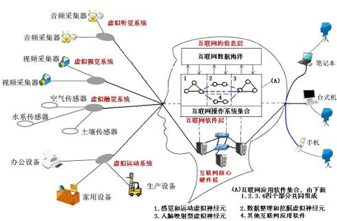 Google的街景系統(tǒng),中國水利部的防汛抗旱傳感器網(wǎng)絡,醫(yī)院的遠程手術(shù)讓我們聯(lián)想到生物的視覺,軀體感覺和運動神經(jīng)系統(tǒng)。到2008年我們發(fā)表論文,繪制出這樣一張互聯(lián)網(wǎng)虛擬大腦結(jié)構(gòu)圖。