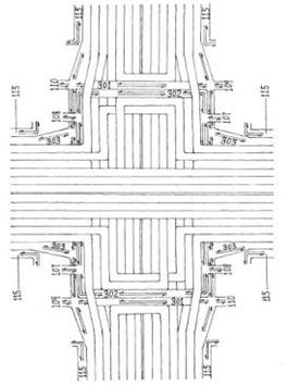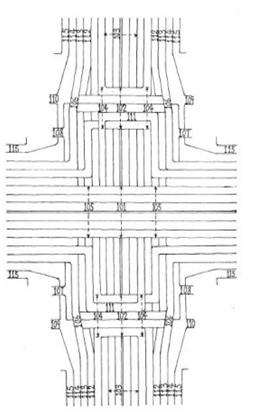 開放型人行道115進入路口前讓位于電動車道??v向電動車道301人行道302位于兩端路面橋上的橫向掉頭車道與縱向高架車道的中間,兩端分別穿越右轉彎車道(高度以電動車行人順利通過為宜)。人行道出入口107、108跨越電動車道,人行道出入口107-108之間(橫向)為地下通道穿越各縱向車道(高度以電動車行人順利通過為宜)。電動車道出入口109-110之間(橫向)為地下通道,穿越人行道入口107、108和各縱向車道(高度以電動車行人順利通過為宜)。