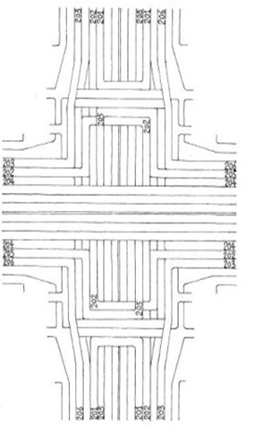 兩橫向左轉彎車道202分別通過兩縱向路面橋實現無交叉左轉,橫向左轉彎車道202分別穿越縱向路面橋上的縱向左轉彎高架車道。兩縱向左轉彎車道205分別通過兩縱向路面橋上的高架車道實現無交叉左轉,縱向左轉彎車道205跨越縱向路面橋上的橫向左轉彎車道202。