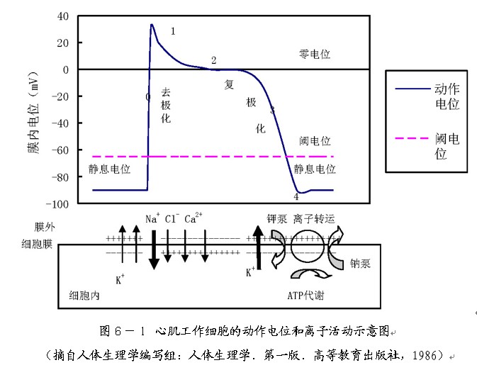 在上圖中,去極化(0期),心肌細(xì)胞受刺激后,靜息電位到達(dá)閾電位時(shí),迅速激活鈉通道,使其開放,造成大量鈉離子內(nèi)流,動(dòng)作電位迅速升高,鈉通道又迅速失活關(guān)閉;快速復(fù)極化初期(1期),鈉離子內(nèi)流停止,氯離子通透性升高,氯離子內(nèi)流,氯離子通道通透性也迅速下降;緩慢復(fù)極化期(2期),鈣離子緩慢內(nèi)流,與此同時(shí),少量鉀離子外流,鈣離子通道的激活和失活過程均緩慢,故稱慢通道;快速復(fù)極化末期(3期),鉀離子外流;靜息期(4期),此期離子轉(zhuǎn)運(yùn)活躍,即把動(dòng)作電位形成期間流入膜內(nèi)的鈉離子,氯離子,鈣離子排出,又把外流的鉀離子攝回,這一過程通過心肌細(xì)胞膜上的Na+-K+泵的作用完成的,需要消耗ATP的生理過程。(本小節(jié)內(nèi)容摘自人體生理學(xué)編寫組:人體生理學(xué).第一版.高等教育出版社,1986)