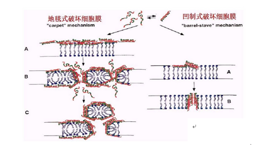 防御素抗菌的作用機(jī)理,目前有兩種不同的抗菌作用機(jī)理被提出,一種是獨(dú)立膜機(jī)制,另一種是防御素結(jié)合細(xì)胞內(nèi)復(fù)合物的機(jī)制。獨(dú)立膜機(jī)制的觀點(diǎn)認(rèn)為, 帶正電荷的防御素與帶負(fù)電荷的細(xì)菌細(xì)胞膜相互吸引,并相互結(jié)合,從而破壞了磷脂雙分子層的完整性,引起靶細(xì)胞膜出現(xiàn)裂隙??煞譃槿齻€(gè)階段:(1)由靜電吸引。防御素與靶細(xì)胞膜結(jié)合。防御素帶正電荷,可通過(guò)靜電作用與帶負(fù)電荷的細(xì)菌膜脂層結(jié)合;(2)通道形成。帶正電荷的防御素分子或其多聚體則與細(xì)菌質(zhì)膜上帶負(fù)電荷的磷脂頭部和水分子相互作用,顯著地增加生物膜的通透性。防御素作用于膜上形成穩(wěn)定的多個(gè)通道;(3)內(nèi)容物外泄。通道形成后,防御素進(jìn)入細(xì)胞內(nèi)的同時(shí),其他胞外分子也伴隨進(jìn)入(如肽、蛋白質(zhì)或無(wú)機(jī)離子),而靶細(xì)胞的重要物質(zhì)(如鹽離子和大分子)滲出,細(xì)胞膜的通透性及細(xì)胞能量狀態(tài)受到了破壞,導(dǎo)致細(xì)胞膜去極化,呼吸作用受到抑制以及細(xì)胞ATP含量下降, 離子和大分子物質(zhì)通過(guò)細(xì)菌的細(xì)胞膜, 最終導(dǎo)致靶細(xì)胞死亡。
