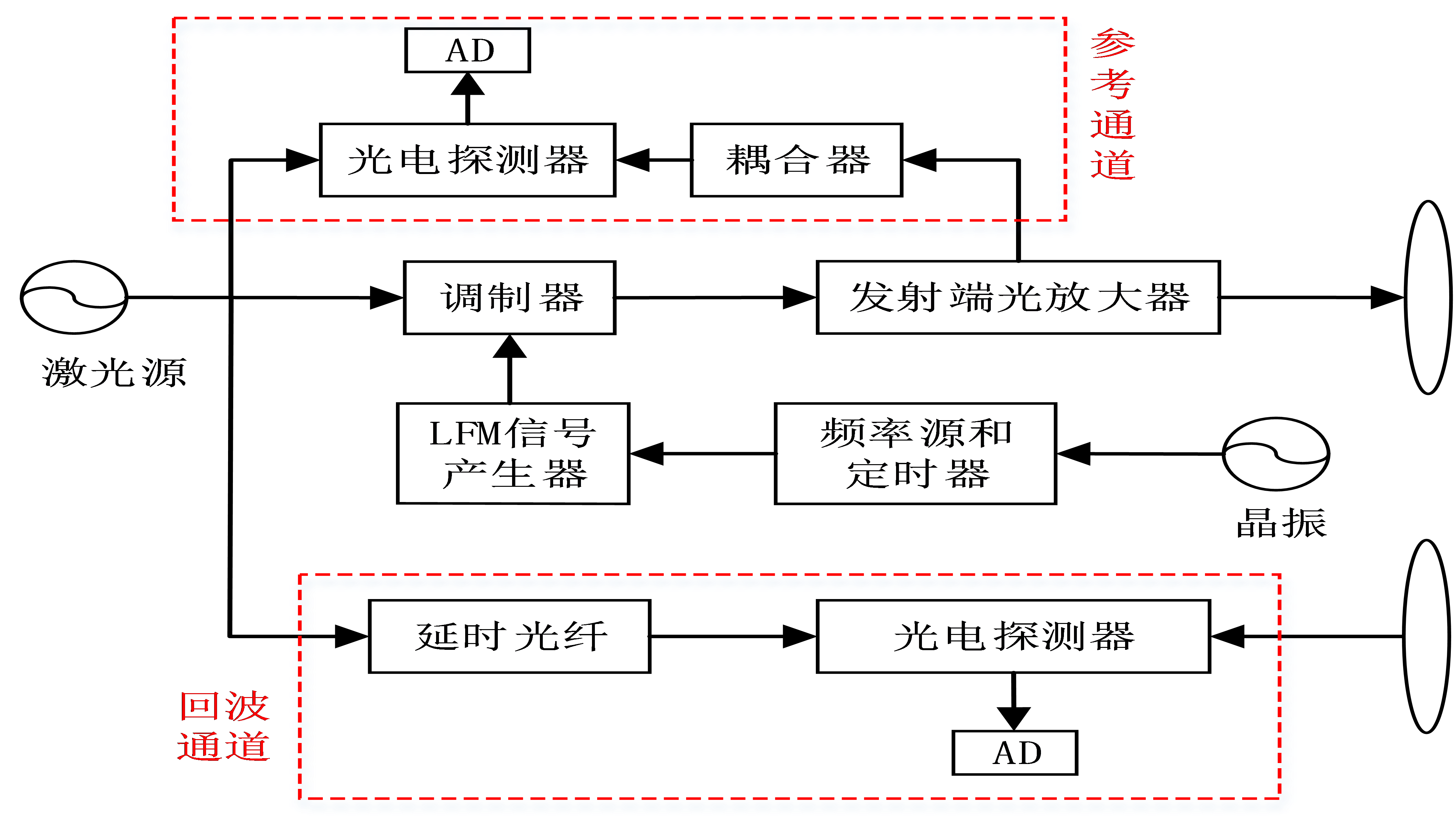設(shè)置發(fā)射信號(hào)參考通道對(duì)其非線性失真相位實(shí)施定標(biāo)校正,以及通過本振延時(shí)光纖實(shí)現(xiàn)信號(hào)相干性保持方法如圖2所示。