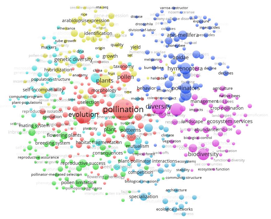 利用Vos Viewer軟件分析2013-2017年中國(guó)傳粉生物學(xué)領(lǐng)域的SCI論文,獲得中國(guó)傳粉生物學(xué)領(lǐng)域的研究熱點(diǎn)是:1)植物花粉管生長(zhǎng)、發(fā)育等分子、細(xì)胞層面基礎(chǔ)機(jī)制研究;2)傳粉昆蟲(chóng)的分類(lèi)學(xué)研究,及其遺傳多樣性、保護(hù)、種群擴(kuò)散等方面的研究;3)昆蟲(chóng)傳粉在植物遺傳育種、進(jìn)化中發(fā)揮重要作用;4)與傳粉相關(guān)的植物轉(zhuǎn)錄因子、microRNA、殺蟲(chóng)劑耐藥性等方面的研究;5)傳粉昆蟲(chóng)的種群優(yōu)化、傳粉昆蟲(chóng)互作等方面的研究。