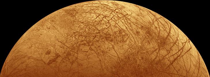 對木衛(wèi)二最早的空間觀測可追溯到上世紀70年代。它的表面平坦;隕石坑很少,只有3個直徑大于5km的。這是美國發(fā)射的旅行者2號拍攝的影像: